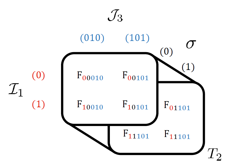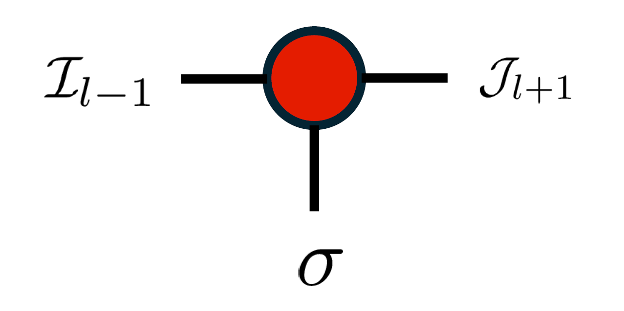 A one-dimensional slice of F is the order 3 tensor with one free external index $\sigma_l$. \begin{equation} T_l=F(\mathcal{I}_{l-1},\sigma_l,\mathcal{J}_{l+1}) \end{equation}