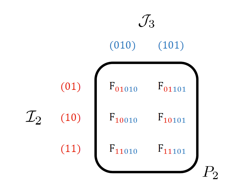 Consider a single element of the pivot matrix $P_2$ with its row labelled by the element of $\mathcal{I}_2$, $i=(01)$, and its column labelled by the element of $\mathcal{J}_{3}$, $j=(010)$. Then the location in the matrix (01,010), holds the element $F_{01010}$. Below is an example of the pivot matrix $P_2$ made up of 6 pivots where the top row contains those included in the table above.